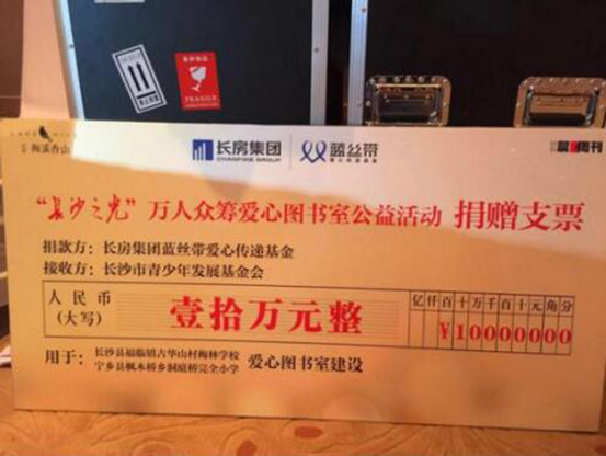 2016年初,晨報周刊攜手長房梅溪香山、長房集團藍絲帶愛心傳遞基金共同發(fā)起“萬人眾籌圖書館”愛心公益活動,為湖南貧困山區(qū)學校捐建圖書室。以點亮希望之光、傳遞溫暖力量為主題的“長沙之光”微信文稿每被轉發(fā)一次,即為籌建山區(qū)學校愛心圖書室捐贈5元?;顒娱_展以來,贏得了許多社會愛心人士的熱烈反響和廣泛共鳴,共有1萬余人次參與活動,最終,通過長房集團藍絲帶愛心傳遞基金捐款10萬元,用于長沙縣福臨鎮(zhèn)古華山村梅林小學和寧鄉(xiāng)縣灰湯鎮(zhèn)洞庭橋完全小學兩所貧困學校愛心書屋的建設,長沙市基少年發(fā)展基金會理事長羊舒麟代表兩所學校接收捐贈。